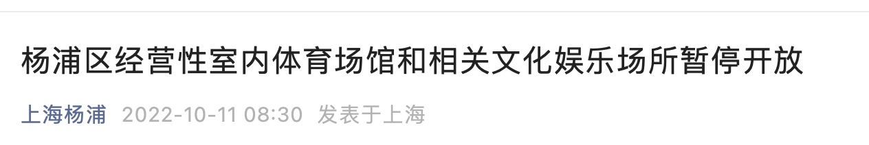 杨浦区经营性室内体育场馆和相关文化娱乐场所暂停开放