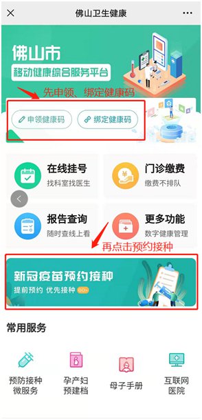 1、进入佛山卫生健康平台主页,先申领健康码,再点击进入预约。