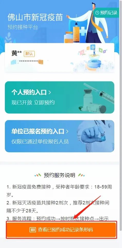 ❶进入佛山卫生健康平台主页,先申领健康码,再点击进入预约。