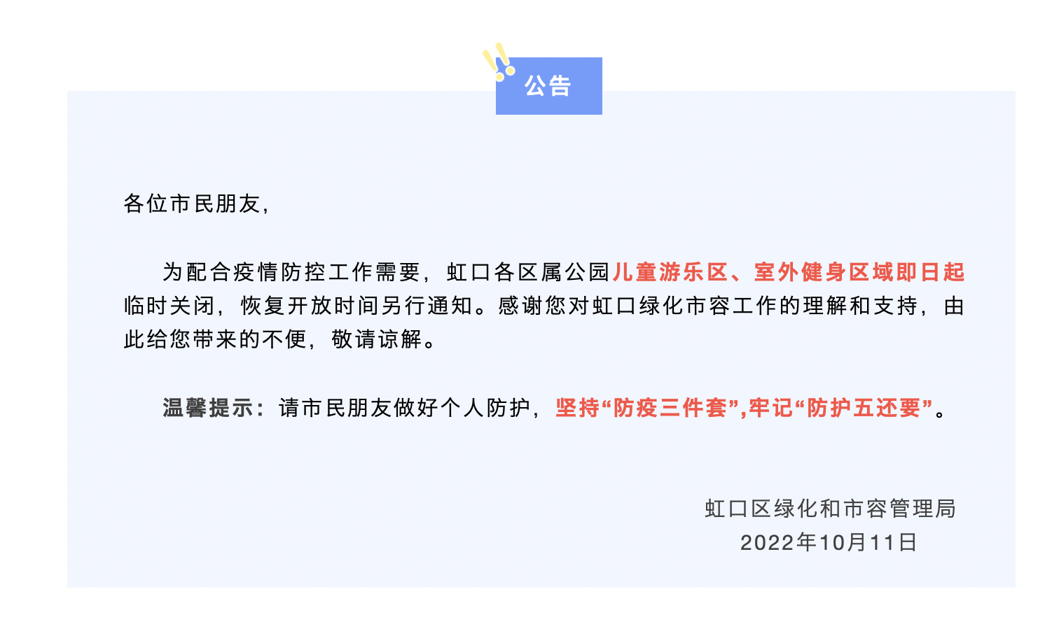 为配合疫情防控工作需要,虹口各区属公园儿童游乐区、室外健身区域10月11日起临时关闭,恢复开放时间另行通知。感谢您对虹口绿化市容工作的理解和支持,由此给您带来的不便,敬请谅解。