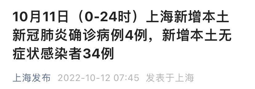上海市卫健委10月12日通报:2022年10月11日0—24时,新增本土确诊病例4例和无症状感染者34例,均在隔离管控中发现。上海10个区域划为疫情中风险区,详情如下。