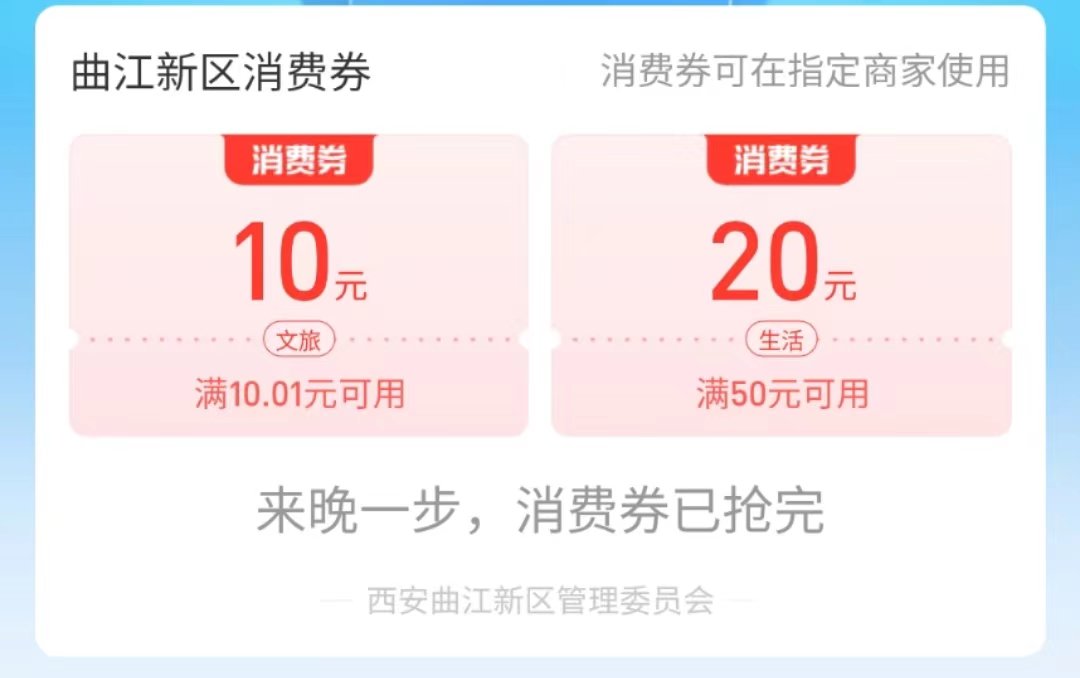 生活券:满50元减20元,用于曲江范围内部分商业综合体,超市,餐厅,书店,影院,黄马甲站;全市范围内西安饮食“老字号”门店和人人乐超市,及世纪金花高新店