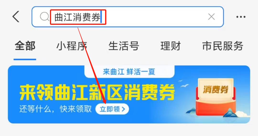 第一步:支付宝首页搜索【曲江消费券】,进入会场点击领取;