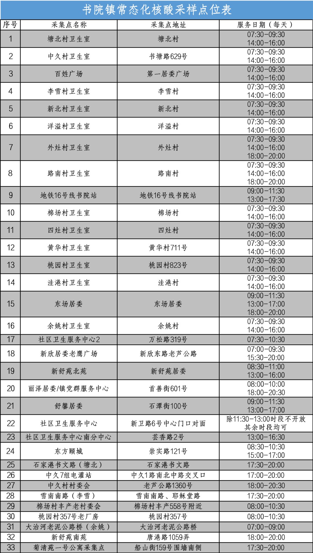 根据村(居)民朋友们的实际需求,即日起,书院镇常态化核酸检测点位开放时间进行相应调整。请大家有序错峰检测,注意出行安全。具体如下: