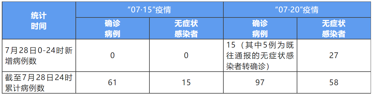 “07·15”疫情无新增本土确诊病例,无新增本土无症状感染者。截至28日24时,本起疫情累计报告本土确诊病例61例,本土无症状感染者15例。