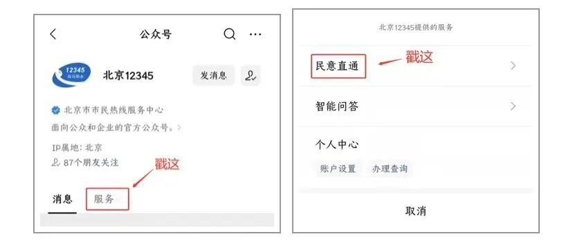 第四步,申诉首先,在“北京12345”微信公众号,点击首页的“服务”选择“民意直通”,注册并登录。