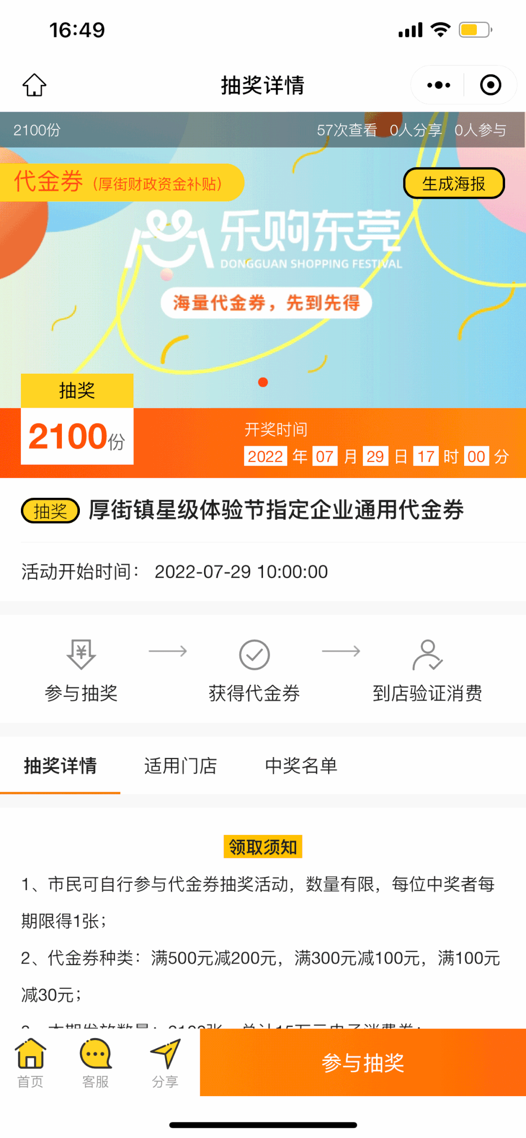 领券方式:进入小程序后点击【镇街消费券】点击【参与抽奖】,就有机会抽取不同金额的消费券。