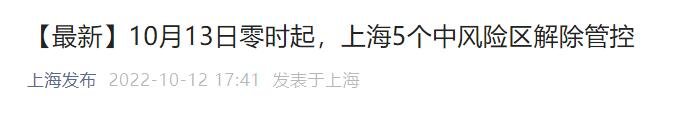 上海市新冠肺炎疫情防控工作领导小组办公室发布消息:根据《新型冠状病毒肺炎防控方案(第九版)》要求,经研究决定,自2022年10月13日零时起,将以下5个中风险区解除管控:
