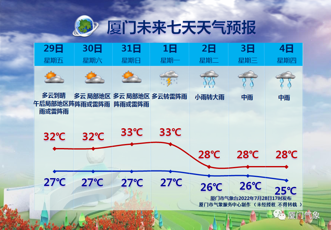 未来三天,受副热带高压外围偏东气流影响,厦门天气以多云为主,午后有分散性的阵雨或雷阵雨,气温在32℃-33℃,体感比较闷热。8月1日,受热带低值系统影响,厦门或将出现明显降水天气,同时日最高气温下降至28℃,天气会凉快许多。