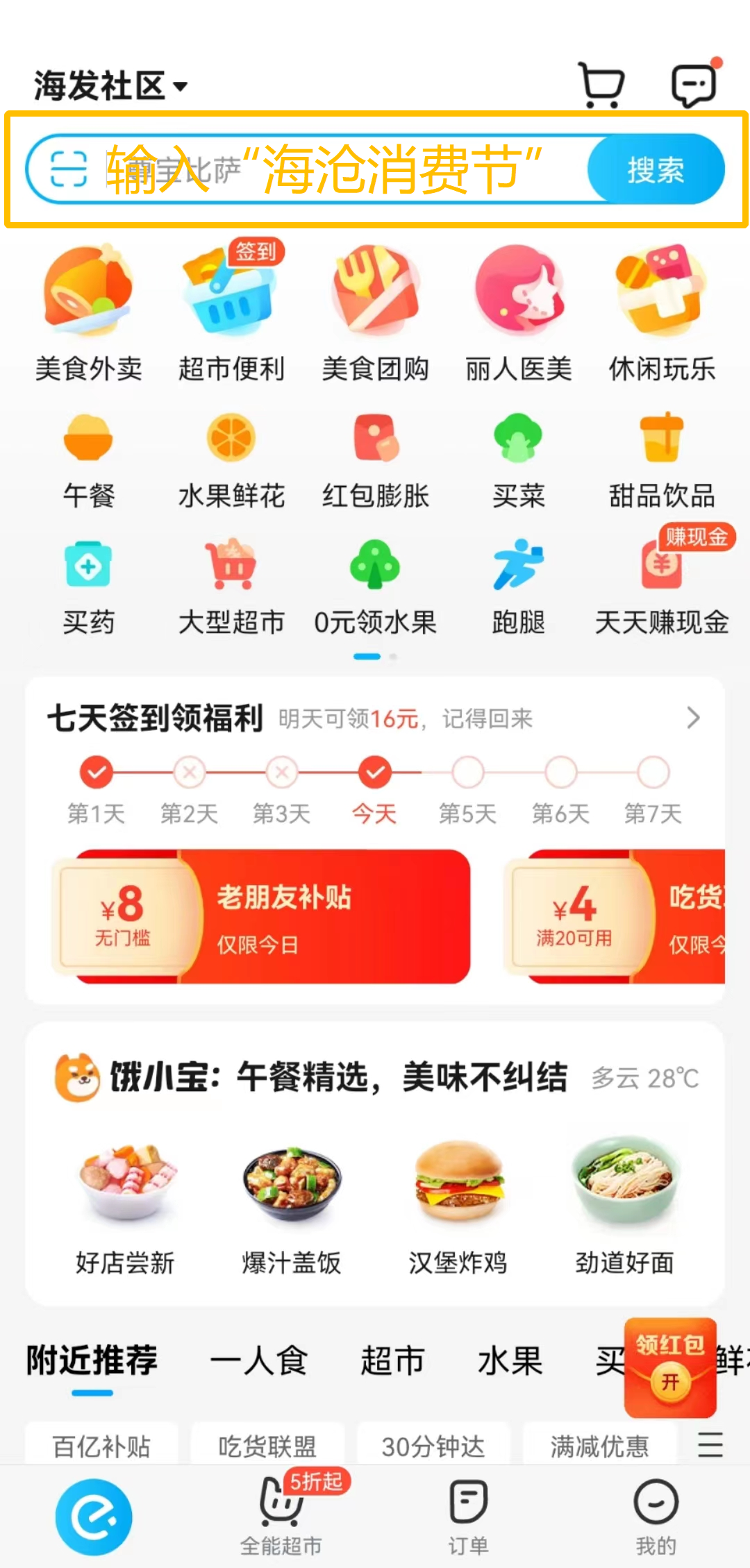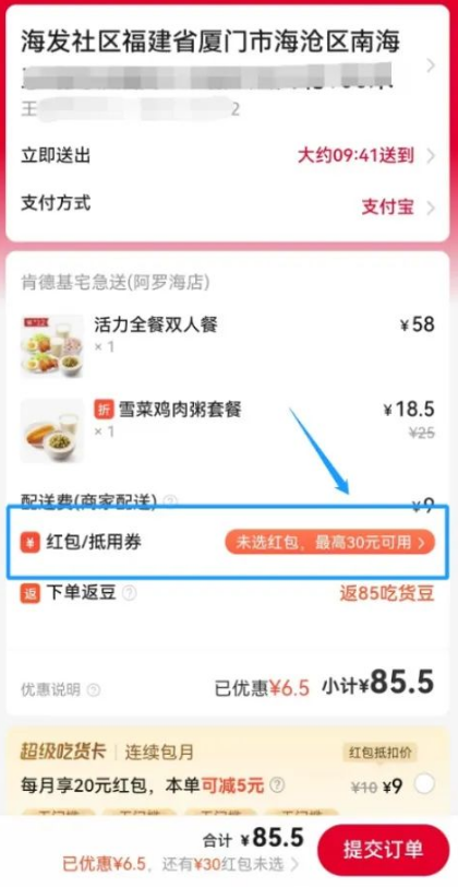通过“饿了么“APP在参与活动的商户点单后进行结算时,点击“红包/抵用券”,选择“海沧消费券“即可使用