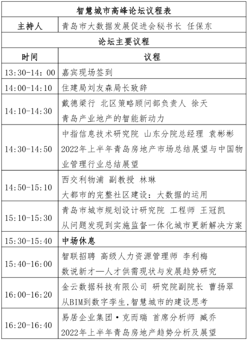 2022青岛宜居博览会智慧城市高峰论坛议程
