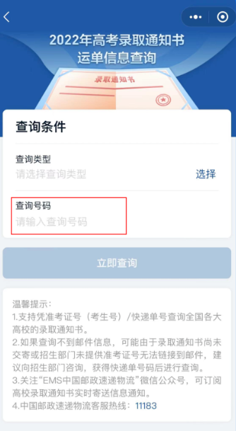 方法二:进入“国务院客户端”小程序“高考录取通知书运单信息查询”服务页面,选择查询类型(准考证号或快递单号),输入查询号码即可获取当前配送信息。