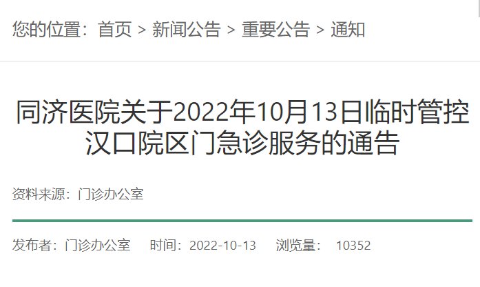 同济医院关于2022年10月13日临时管控汉口院区门急诊服务的通告