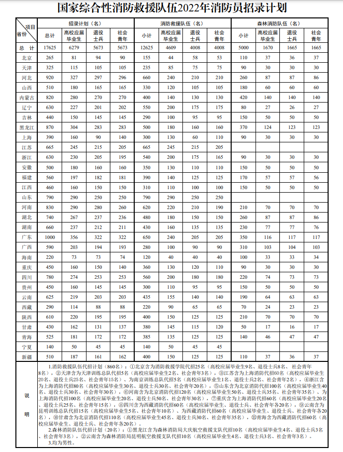 国家综合性消防救援队伍2022年消防员招录计划一览表