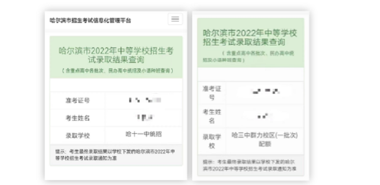 温馨提醒:哈尔滨市2022年中等学校招生考试录取结果查询包含重点高中各批次、民办高中统招及小语种班查询。