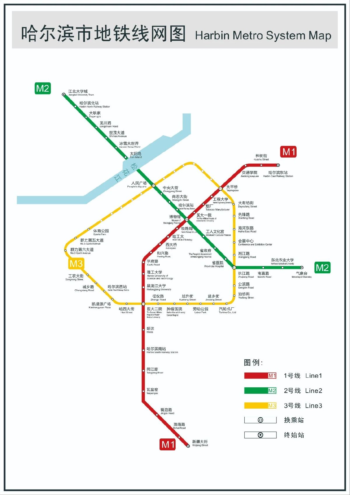 气象台——东北农业大学——南直路3号线——珠江路——省医院省政府——工人文化宫——博物馆——哈尔滨站——尚志大街——中央大街——人民广场——太阳岛——冰雪大世界——世茂大道——龙川路——大耿家——哈尔滨北站——江北大学