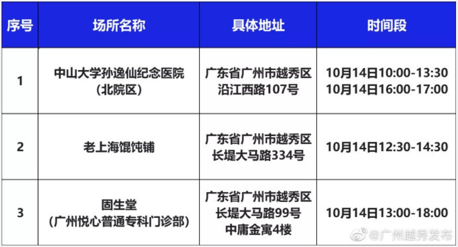 因新冠疫情防控需要,请在相关时段到过越秀区下述重点场所的人员,立即向所在社区联系报备,严格落实“3天3检”,并配合做好疫情防控各项措施。若不如实申报,不落实防控措施,造成严重后果的,将承担相应法律责任。