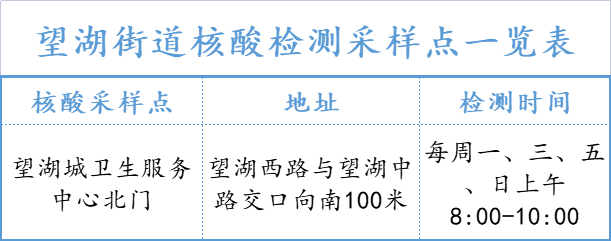 为方便28类重点人群免费采样,望湖街道设置了1处核酸检测点,面向社会开放,有检测需求的,可按照自愿就近原则前往检测。