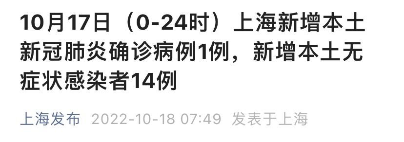 上海市卫健委10月18日通报:2022年10月17日0—24时,新增本土确诊病例1例和无症状感染者14例,均在隔离管控中发现,详情如下。