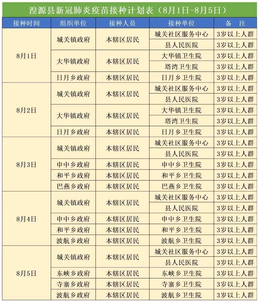 西宁湟源县新冠疫苗接种计划(8月1日至8月5日)
