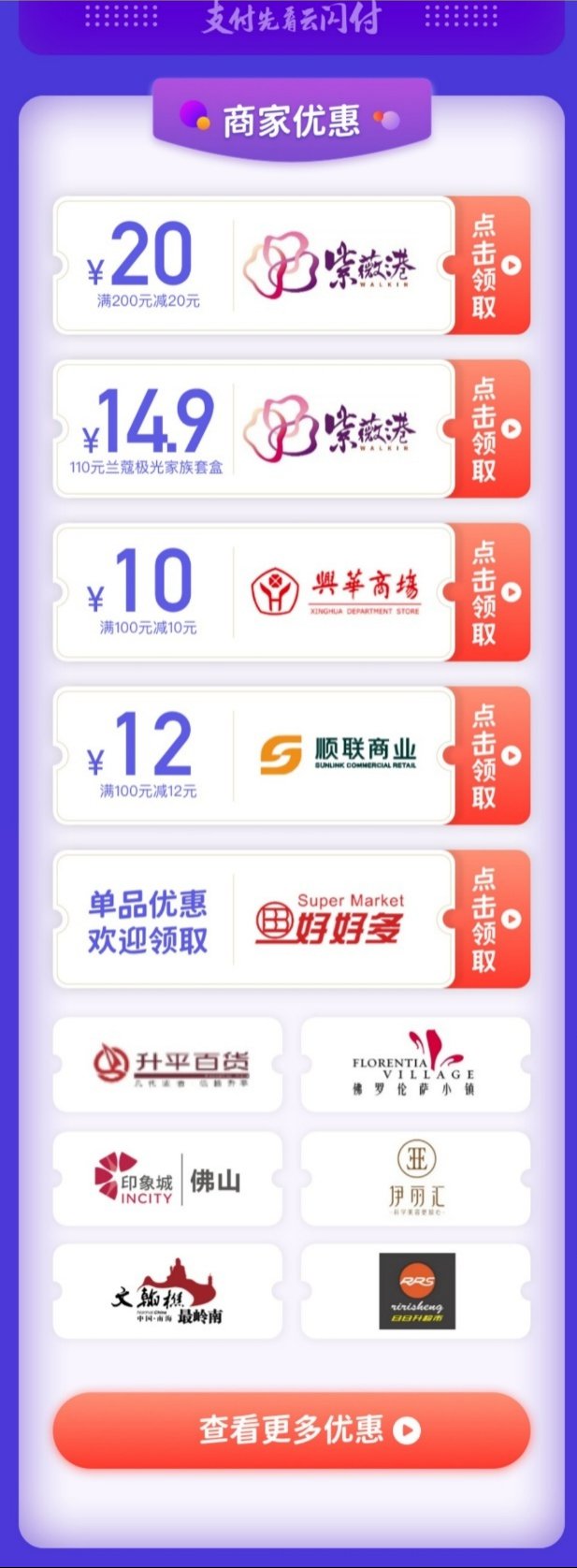 针对本次活动,银联分公司、商业银行、商贸企业让利总额超过1000万,优惠遍布佛山本地生活消费全领域。银联补贴、商家让利、银行优惠三重福利大礼,补贴优惠超千万,消费者下载云闪付APP可以在各大综合体、连锁超市、景区享受低至六二折的购物优惠活动。
