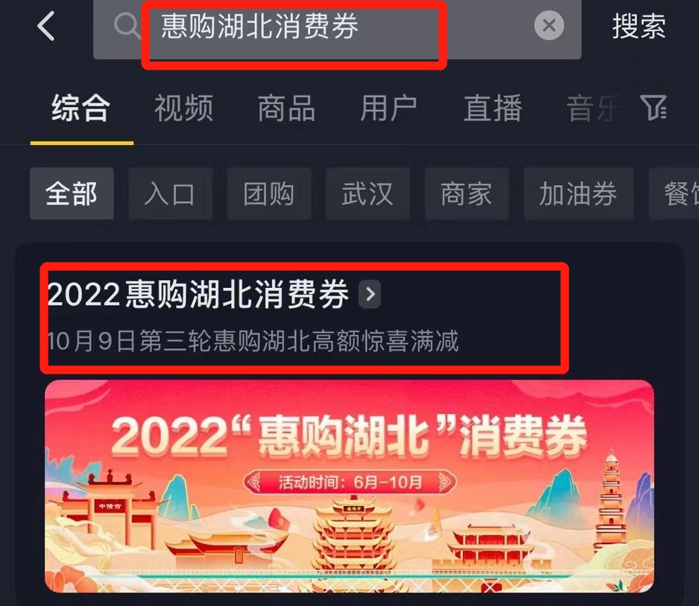 进入抖音首页,活动期间,在上方搜索框输入【惠购湖北消费券】,即可进入活动页面进行抢券。