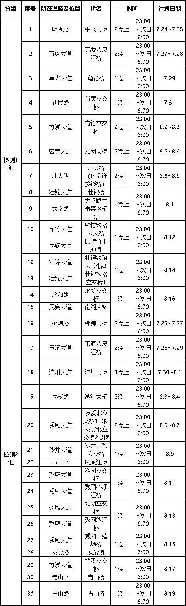 一、从2022年7月27日起,至2022年8月19日24时止,对南宁市30座桥梁部分车道实施封闭施工,具体时间安排附后。