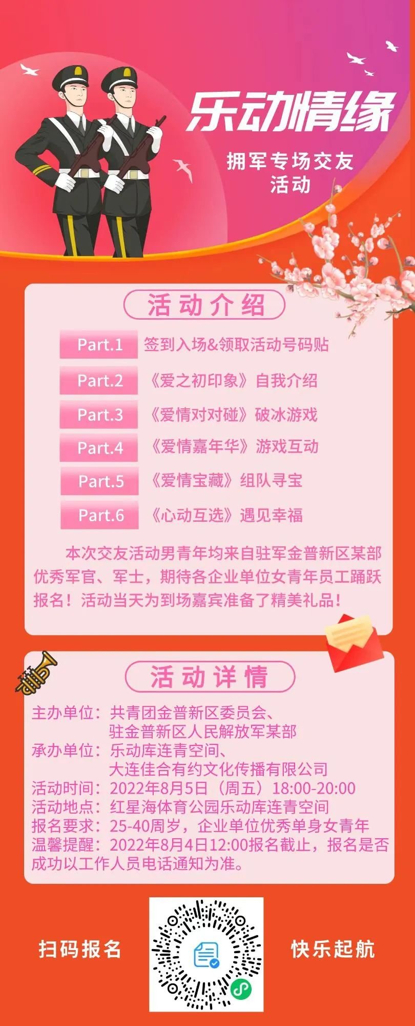 在这个浪漫的七夕及庆祝建军95周年之际,乐动库连青空间拥军专场青年交友活动精彩上线!本次活动由共青团金普新区委员会和驻金普新区中国人民解放军某部共同主办,届时会有20名来自部队的优秀单身男军官、军士参与到活动当中。现场还设置体验式游戏环节,在游戏展现军人风采、军地情怀、军旅生活等,给大家一个深入了解军人的机会,寻找心动的“TA”,来一次“牵手之恋”。期待各优秀单身女青年踊跃报名参与。