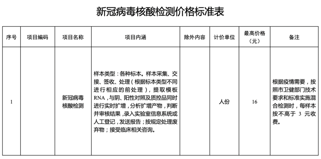 一、公立医疗机构新冠病毒核酸混合检测价格每人份不高于3元,单人单检价格仍为每人份不高于16元。