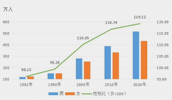全市常住人口[2]中,男性人口为5163849人,占54.36%;女性人口为4335014人,占45.64%。总人口性别比(以女性为100,男性对女性的比例)由2010年第六次全国人口普查的116.74上升为119.12。