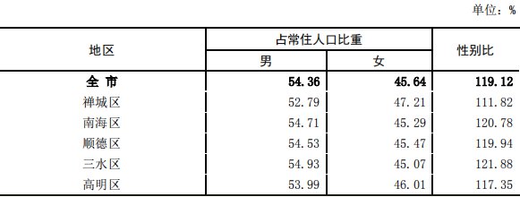 佛山第七次人口普查性别构成情况一览