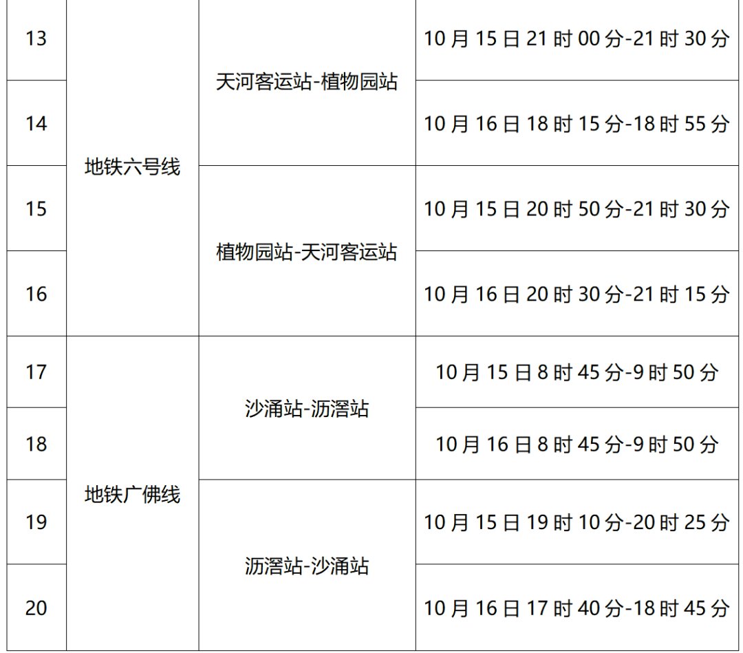 因疫情防控需要,在10月15日-16日以下时间段相应区间站曾乘坐广州地铁一号线、二号线、三号线、六号线、广佛线以及在相应站内换乘的市民朋友,请主动向社区报备并就近进行核酸检测,做好3天3检及自我健康监测,如出现不适,请在做好个人防护基础上及时就医。