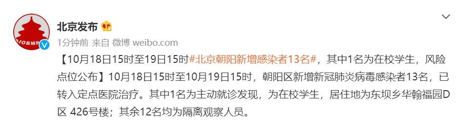 10月18日15时至10月19日15时,朝阳区新增新冠肺炎病毒感染者13名,已转入定点医院治疗。其中1名为主动就诊发现,为在校学生,居住地为东坝乡华翰福园D区 426号楼;其余12名均为隔离观察人员。