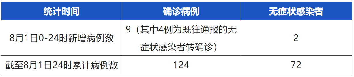 8月1日0-24时,“07·20”疫情新增本土确诊病例9例(其中4例为既往通报的无症状感染者转确诊),新增本土无症状感染者2例。截至8月1日24时,本起疫情累计报告本土确诊病例124例,本土无症状感染者72例。