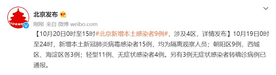 10月20日0至15时北京新增9例感染者 北京感染者已达15人