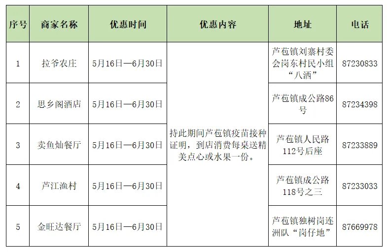 即日起至6月30日期间,持此期间在芦苞接种的相关证明,到以下餐饮店消费,每桌送精美点心或水果一份。