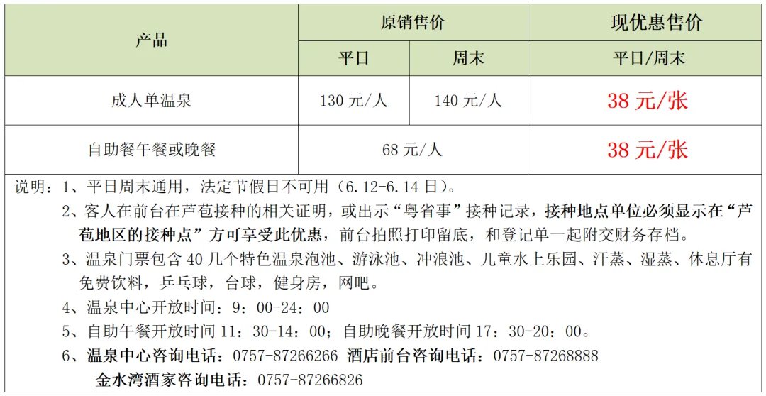 即日起至6月30日期间,持有在芦苞接种的相关证明或通过粤康码出示在芦苞接种的记录,即可以38元的超优惠折扣价,购买芦苞温泉成人单温泉门票、自助餐午餐或晚餐。