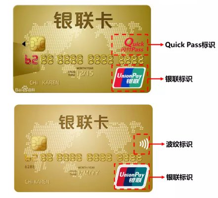 使用闪付银行卡,需是银联标准的银行卡,银行卡号以“62”开头,另外卡面应有Quick pass标识或者波纹标识。两种类型卡样式如下: