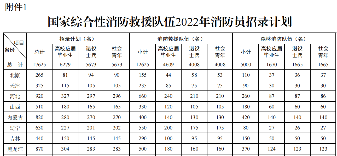 经应急管理部、人力资源社会保障部批准,此次国家综合性消防救援队伍共招录消防员17625名(均为男性),其中:高校应届毕业生6279名、退役士兵5673名、社会青年5673名。具体招录计划见附件1。