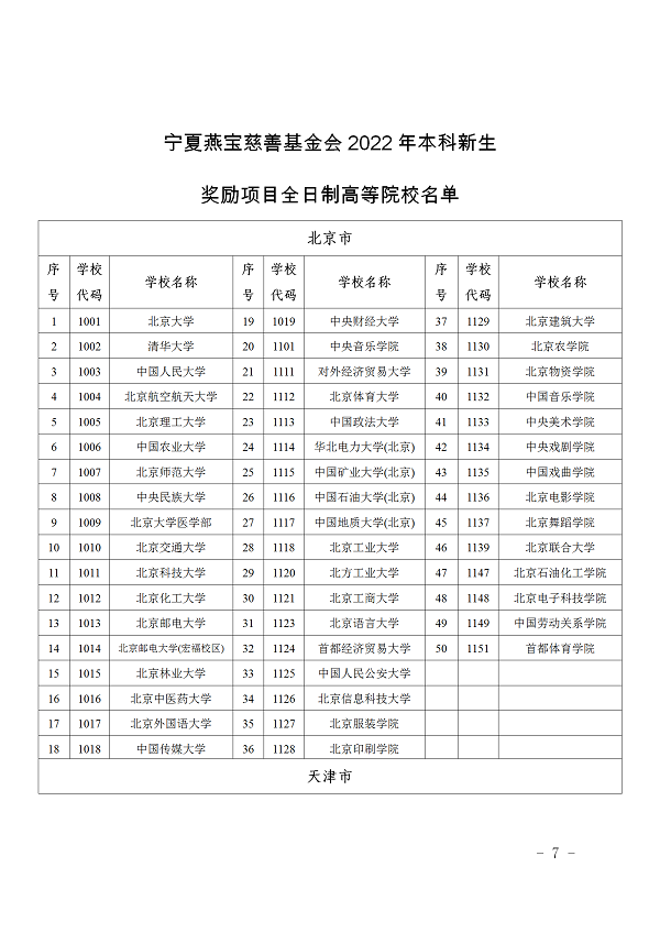 宁夏燕宝慈善基金会2022年本科新生奖励项目全日制高等院校名单