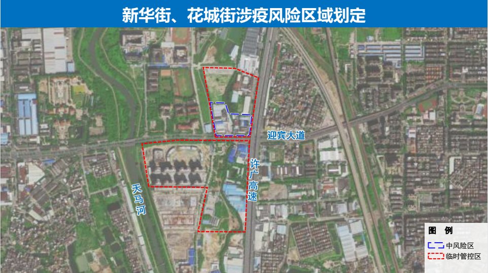 新华街迎宾大道、许广高速、中新大街延长线、无名道路、哥弟家元建筑工地合围区域(中、高风险区除外)。