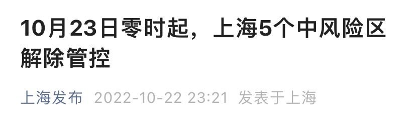 上海市新冠肺炎疫情防控工作领导小组办公室发布消息:根据《新型冠状病毒肺炎防控方案(第九版)》要求,经研究决定,自2022年10月23日零时起,将以下5个中风险区解除管控:
