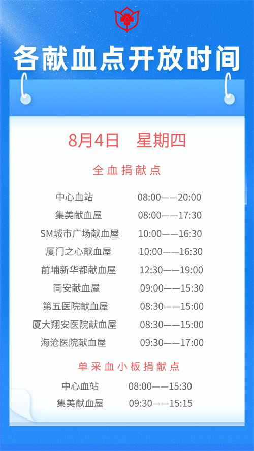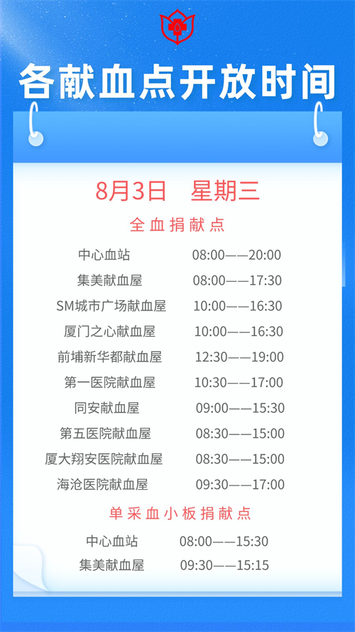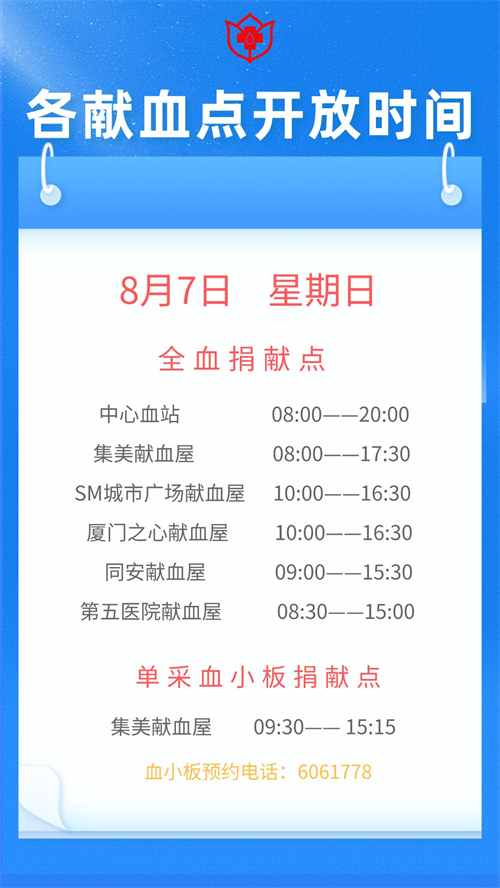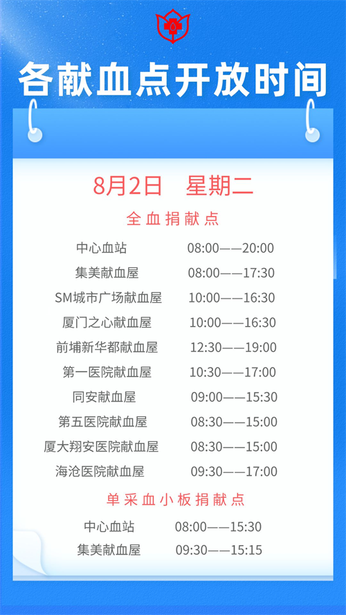 厦门献血地点以及营业时间(2022年8月1日-7日)