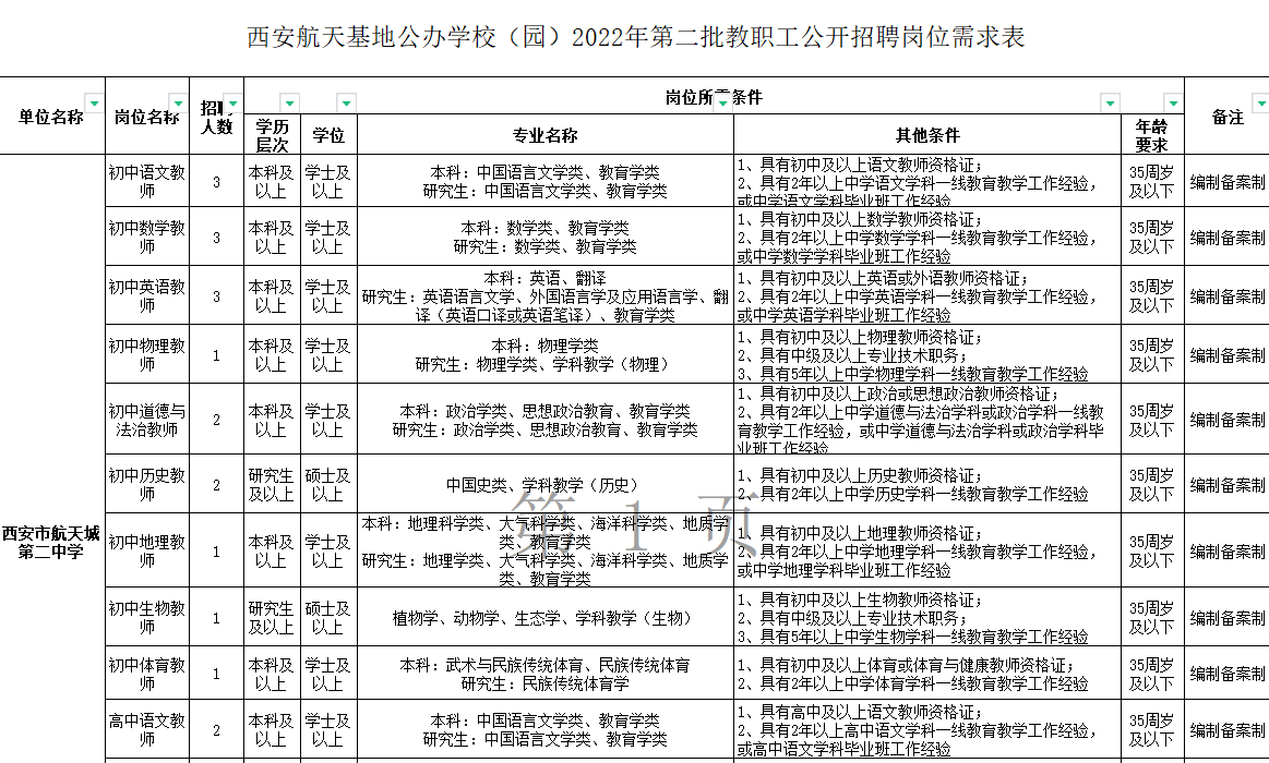 >>>>> 西安航天基地公办学校第二批教师招聘岗位表