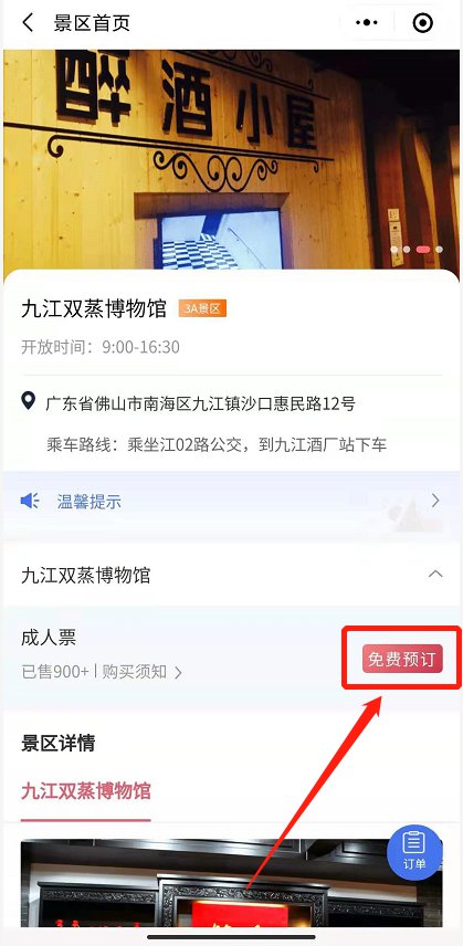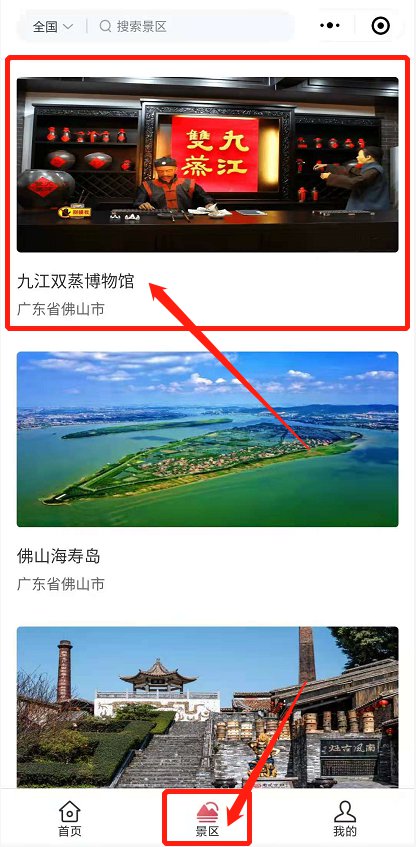 第二步:进入预约页面(微信小程序),点击“景区”,找到“九江双蒸博物馆”,点击进入