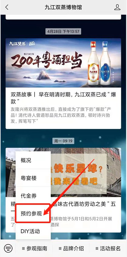 第一步:关注九江双蒸博物馆公众号,点击右下方底部菜单栏“参观预约”。