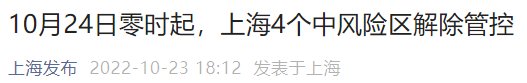 市新冠肺炎疫情防控工作领导小组办公室发布消息:根据《新型冠状病毒肺炎防控方案(第九版)》要求,经研究决定,自2022年10月24日零时起,将以下4个中风险区解除管控: