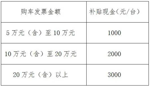 按购车发票金额(单车销售价格需为购车发票含税金额)补贴分为三档,具体标准如下: