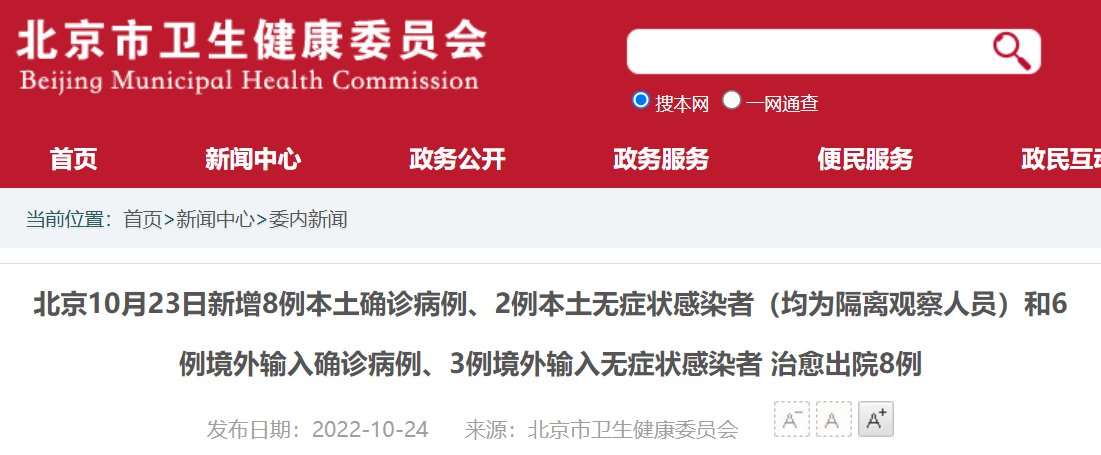 10月23日0时至24时,新增8例本土确诊病例(含1例无症状感染者转确诊病例,均已通报)和2例无症状感染者(已通报),均为隔离观察人员,无新增疑似病例;新增6例境外输入确诊病例(含1例无症状感染者转确诊病例)和3例无症状感染者,无新增疑似病例。治愈出院8例,解除医学观察的无症状感染者4例。