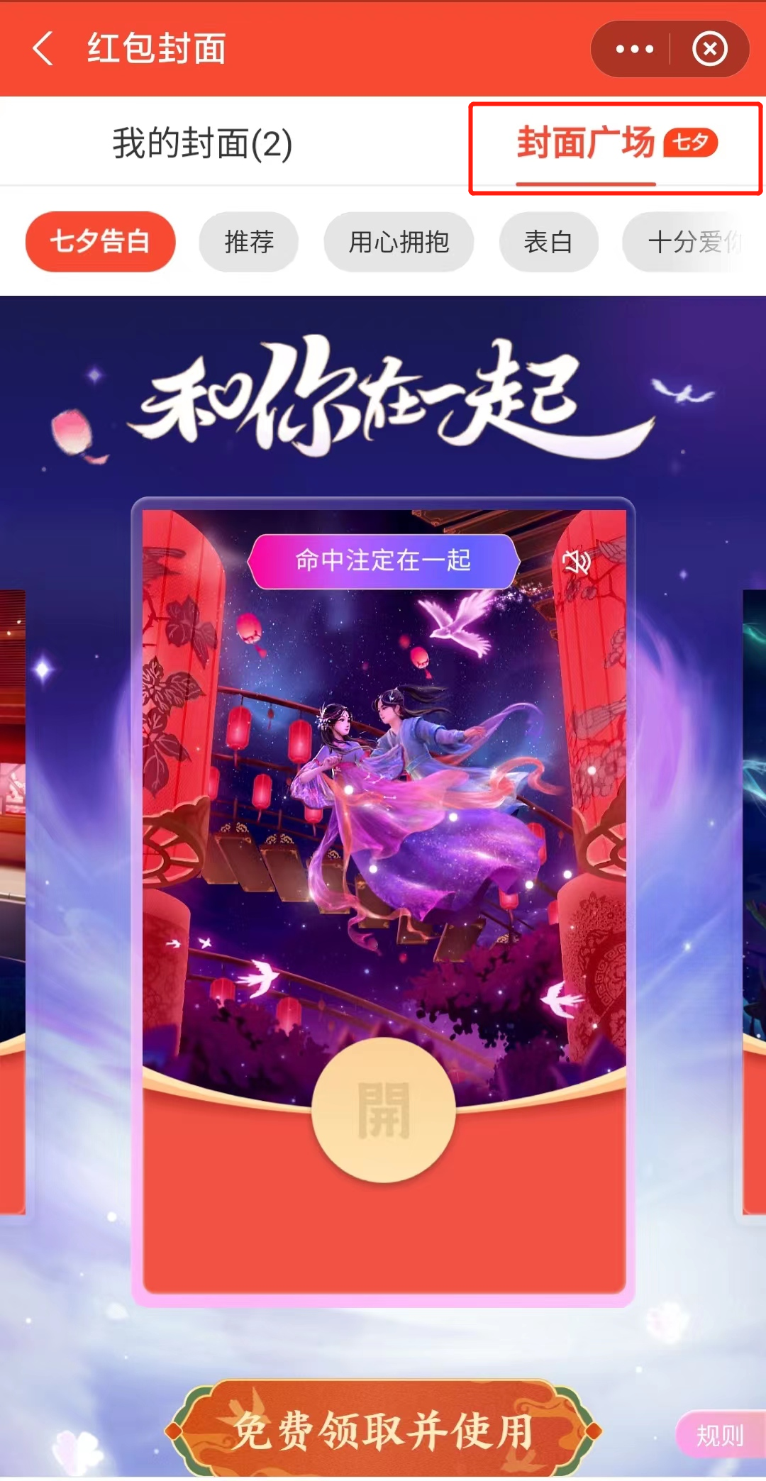 第四步,进入到封面广场,选择七夕告白专题,点击“七夕红包封面”下面“免费领取”即可。